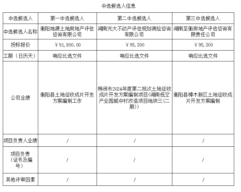 衡陽市植物園片區(qū)三宗土地征收成片開發(fā)方案編制項(xiàng)目成片開發(fā)方案咨詢服務(wù)比選于2025年09月25日15時(shí)00分在衡陽國投4棟3樓評標(biāo)室進(jìn)行了比選開標(biāo)、評標(biāo)活動,評標(biāo)委員會按照比選文件及相關(guān)法律法規(guī)規(guī)定進(jìn)行評審,推薦以下三名中選候選人(排序),現(xiàn)將相關(guān)信息予以公示。
